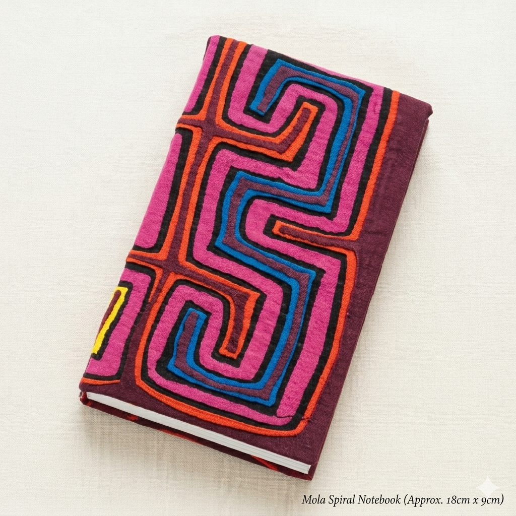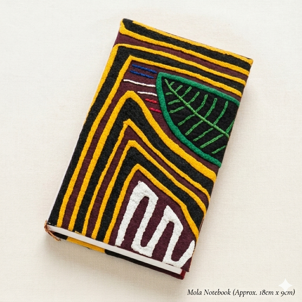 Exclusiva agenda artesanal decorada con una mola auténtica, pieza textil icónica de la cultura Guna (región de Urabá). Elaborada a mano mediante la técnica de superposición de capas, esta pieza destaca por sus colores vibrantes y patrones geométricos únicos. Es una combinación perfecta de utilidad y arte indígena colombiano, donde cada diseño es irrepetible y cargado de significado ancestral.