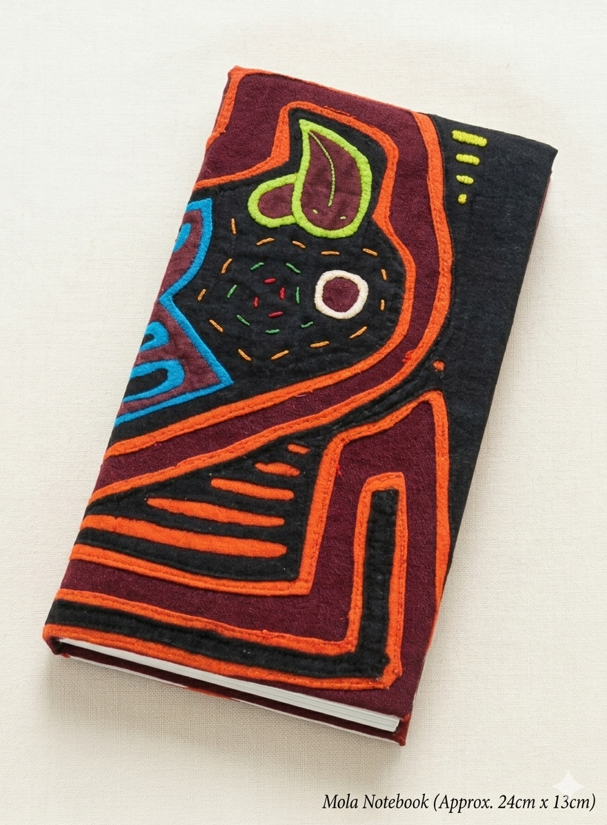 Esta libreta o agenda artesanal está revestida con una mola auténtica, una forma de arte textil elaborada por la comunidad Guna (Kuna), que habita principalmente en la región del Golfo de Urabá en Colombia y en el archipiélago de San Blas en Panamá. Cada mola es una pieza irrepetible, pues se crea mediante una técnica compleja de aplicación invertida. Esto implica superponer varias capas de telas de distintos colores, las cuales se van cortando y cosiendo a mano con puntadas casi invisibles para revelar los colores de las capas inferiores y formar diseños geométricos o figurativos.
